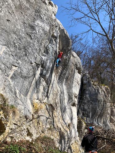 Überraschend gute Tour! Für Freunde der bohrhakenlosen Kletterei absolut empfehlenswert. Je nach Größe, moralischer Einstieg und danach gut absicherbare tolle Verschneidungskletterei. Ab dem guten Normalhaken wirds dann deutlich entspannter. Der „gute“ schlaghaken kam übrigens bei minimaler zugbelastung entgegen! Dank geht raus an Simon fürs sanieren -
