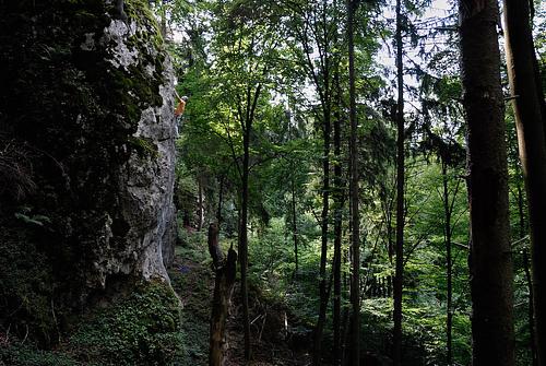 Eigentlich sehr schöner und gemütlicher Einstieg - jedoch echt richtig staubig und dreckig. Dafür wird man dann mit einem frankentypischen Dachboulder belohnt (nachdem man sich mit den Riesenspinnen in den Griffen angelegt hat) und kann die technisch anspruchsvollen Meter des Ausstieges rausturnen. Fand die Tour gar nicht so viel leichter wie die "Uferlos" -