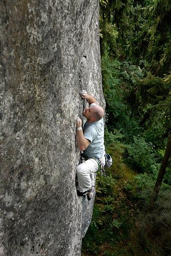 "gefühlter 10er....." :-) Richtig schöne "Zubringer-Meter", spannende Querung und dann eine schier uferlose Plattenstelle, die scheinbar auf mehrere verschiedene Arten überwunden werden könnte. Doch welche nun die beste ist, erschließt sich nicht auf Anhieb. Auf alle Fälle ein Klassiker - sieht man auch an den Begehungsspuren. Allgemeine Stimmungsabfrage zum Bandmaterial am Umlenker: Darf ich das alte Schnürlzeugs rausnehmen? Finde es schöner - nachdem man auf der wackligen Platte aufsteht - in die natürliche Sanduhr zu greifen als ins Textil. Der letzte Bolt sollte ja zum Nullern ausreichen, um das Top zu erreichen. Wenns keine Gegenstimmen gibt, würd ich dann mal zum Messer greifen .. Immer raus damit! Wer eine Schlinge braucht, sollte sie legen und anschließend aber auch wieder entfernen! Keine Einwände meinerseits, ich kann mich nicht mal erinnern, daß da oben eine Sanduhr existiert. -