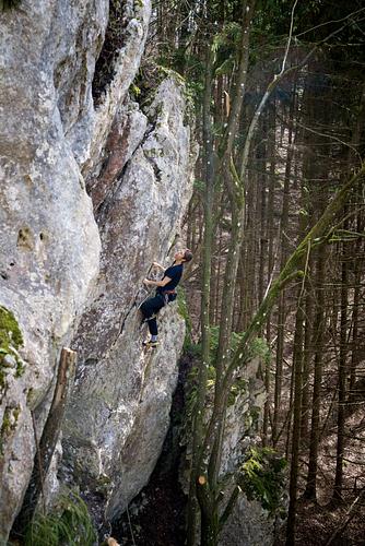 2. Route von ganz links am Fels. Schwierigste Stelle direkt am 1.H. Danach die Henkel rechterhand nicht übersehen... Ausrüstung: 4 Laschen + 1ULAbsicherung:klassisch