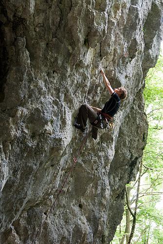 nette kleine tour, um sich an die hier vorherrschende neigung zu gewöhnen. wenn man's kennt, gibt's auch nen guten warm up her, da recht gängige züge an angenehm dimensionierten griffen, wenngleich es vom 4. zum 5. haken durchaus nicht banal ist. und obacht beim klippen des 4. hakens, da kann mal ganz locker noch erden! Der Cliphenkel des 4. Hakens wackelt ordentlich. Herrausnehmen kann man ihn allerdings nicht. Falls der beim Clippen rauskommt, wirds sehr eng. Helm und ordentliche Obacht geben empfiehlt sich. -