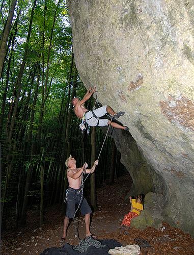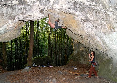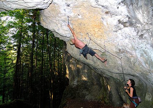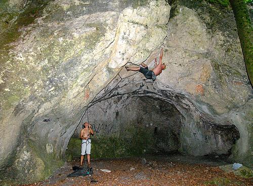 Startet ganz hinten in der Höhle, sozusagen direkt im Nirvana ;) Mal mit den Füßen, mal mit dem Kopf voraus, aber immer mit hooks und knieklemmern gehts stetig der Sonne entgegen. Nach dem ersten schweren Boulder kann man nochmal kurz schütteln, dann darf man noch die Jagdfieber-Crux dranhängen. Mit Abstand das steilste was das Labertal zu bieten hat (mehr Dach als Höhenmeter) :) Absicherung:klassisch
