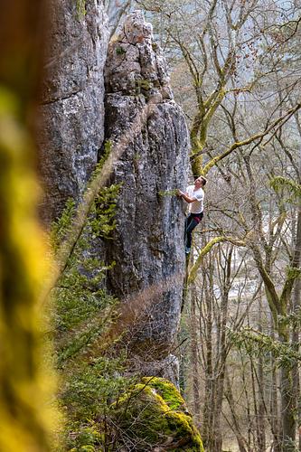 Rechtseinstieg zu "Wood in the roots". Schwerer Boulder vom 1. zum 2. Haken. Danach noch dran bleiben mit schlechten Tritten, aber ganz guten Griffen. Protection:classic