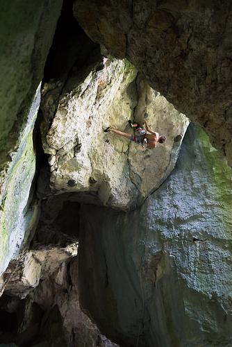 Rechteste Tour am Pfeiler vor der Höhle (von draußen betrachtet), steiler Bouldereinstieg und leicht überhängende Wand Gear: 6 Bohrhaken (Longlifes) + 1 Umlenkbühler mit SchrauberProtection:classic