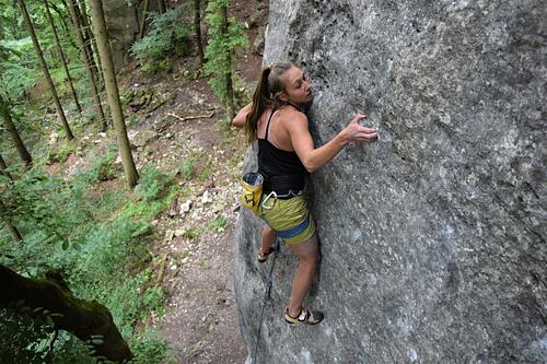 Der heiße Sommer hat auch seine guten Seiten...Man muss mal nicht an die Schellneck und kommt folglich dazu, die unbekannteren Touren in der Höhle zu klettern. Sehr unscheinbar von unten, dann aber echt coole Züge durch recht steiles Terrain. Abzüge in der B-Note gibt es nur für den echt scharfen Fels...Autsch! -