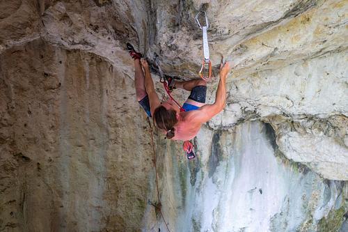 "Endspurt" hoch bis zum Untergriffhenkel, dann mit dreidimensionaler Kletterei durchs Dach und wieder zurück zum Endspurt-Umlenker. Protection:classic