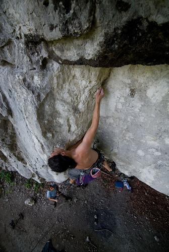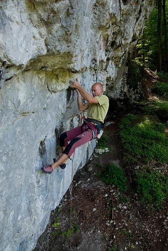 Nettes frankenartiges Gehampele. Leider lange feucht. An der Schlüsselstelle hängt die Schwierigkeit auch davon, ab ob man den Bold zum Klippen verlängert. (Oder wurde das schon eingerechnet?? Also ich lass die zwei Laschen beim Klippen einfach aus und hänge nur die Bühler ein, dann ist das Einhängen kein Problem. durch den ausgeprägten hallencharakter bestes altöltaldefizittraining. der ewige schleim in der tour "gehört einfach dazu", denn er ging wohl mit in die bewertung ein. aber immerhin sind die schlechtesten griffe auch die trockensten. hmm, vielleicht könnte man ja zur schonung der haxen die einflugschneise etwas ausheben und mit dem zeug unterm abstoß den erodierten hang wieder aufschütten, ebenfalls zur haxenschonung? allerdings gibt’s dort ja inzwischen auch ne ganz ehrliche einstiegslösung. -