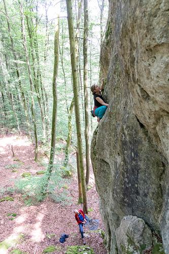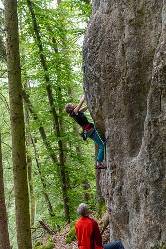 Lässige Tour, kann mich der Beschreibung im Kletterführer nicht ganz anschließen. Einstiegsboulder und dann ab dem dritten Haken an großen Griffen schön zum Umlenker. Der Einstiegsboulder ist tatsächlich schwierig zu lesen. Je nach Variante würde ich mal sagen 7- bis 8-. Hat man die richtigen Griffe aber erstmal gefunden ist es eine ziemlich gute Tour. -