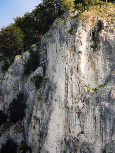 Gute Route mit schönen Zügen die am Nachmittag noch lange im Schatten ist. Leider ohne vorklippen des hohen ersten Hakens fast nicht kletterbar da dort die Crux lauert und das Gelände nicht zu einem Absprung einlädt. -