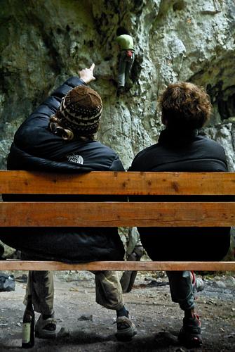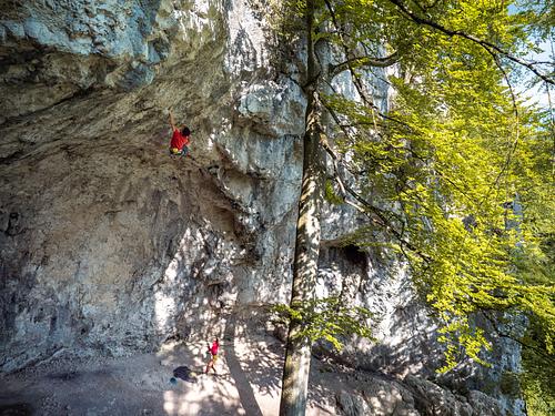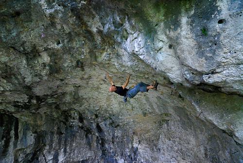 nette kleine tour, um sich an die hier vorherrschende neigung zu gewöhnen. wenn man's kennt, gibt's auch nen guten warm up her, da recht gängige züge an angenehm dimensionierten griffen, wenngleich es vom 4. zum 5. haken durchaus nicht banal ist. und obacht beim klippen des 4. hakens, da kann mal ganz locker noch erden! Der Cliphenkel des 4. Hakens wackelt ordentlich. Herrausnehmen kann man ihn allerdings nicht. Falls der beim Clippen rauskommt, wirds sehr eng. Helm und ordentliche Obacht geben empfiehlt sich. -