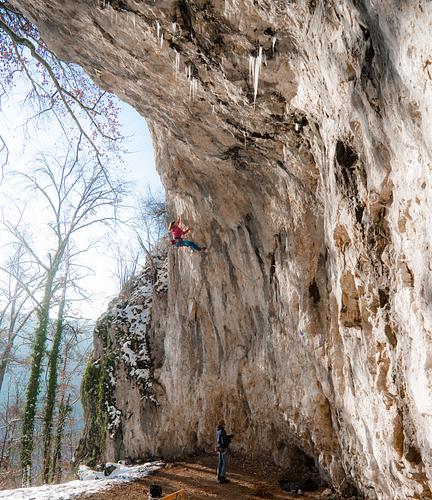Die Henkel direkt rechts neben der Höhle könnten sich schon sehr bald verabschieden, was bei der Steilheit und der betroffenen Fläche sehr unangenehme Folgen für den Athlet sowie das Sicherungspersonal haben könnte. Lieber woanders aufwärmen. -