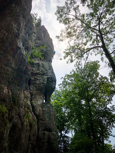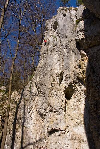 Sehr schöne Tour, die eine schöne Linie gerade den Pfeiler hinauf beschreibt. Im aktuellen Führer steht die Route mit 8- drin und sie fühlt sich, nicht erst seit einem Trittausbruch neben dem vorletzten Haken, auch wirklich so an. -