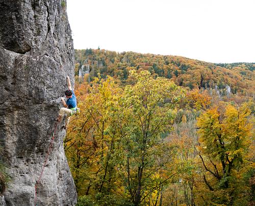 noch so ne ausdauerperle hier, die nen positiven affenfaktor mit gutgriffiger athletik belohnt, ohne durch banale bewegungsaufgaben zu langweilen. beschränkte reichweite (< 1,75 m) hebt jedoch in der cruxpassage den individuellen anspruch deutlich an, oben nach dem rastpunkt dagegen wohl lediglich die zugzahl. Hmm, ist ja schon etwas her... wenn ich mich recht erinnere, war das war so ab dem Band gesehen in Wandmitte: ewig weiter Zug mit rechts auf nen Seitgriff mit relativ schlechten Tritten. Dann war's schwer, die Füße hochzukriegen (sehr hoch ansteigen mit links) um das aufzulösen. So ungefähr... ;-) Was ein genuss zu klettern wenn man der Tour gewachsen ist. Aber schon etwas schwer zu holen für 8+. Ich finde die Bewertung ok wenn man hin und wieder etwas links der Haken klettert. Aber ich hab mich auch schwerer getan, als in den meisten 9-en im Tal. Das liegt aber wahrscheinlich eher daran, dass die Anforderung an die Ausdauer Altmühltal-untypisch hoch ist und man das halt nicht so gewohnt ist. -
