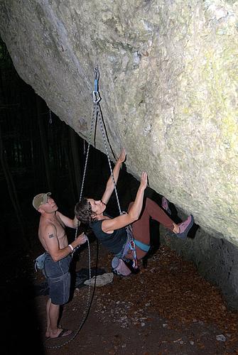 Startet ganz hinten in der Höhle, sozusagen direkt im Nirvana ;) Mal mit den Füßen, mal mit dem Kopf voraus, aber immer mit hooks und knieklemmern gehts stetig der Sonne entgegen. Nach dem ersten schweren Boulder kann man nochmal kurz schütteln, dann darf man noch die Jagdfieber-Crux dranhängen. Mit Abstand das steilste was das Labertal zu bieten hat (mehr Dach als Höhenmeter) :) Protection:classic