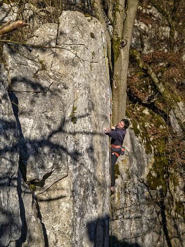 dass die altmeister dem drehmoment schon vor 20 jahren ein anständiges schnippchen zu schlagen wussten, zeigt dieses kurzweilige technik-testpiece recht eindrucksvoll. beste linie hier im sektor, quasi mr. bad guy für normalverbraucher. Ich habe leider den Eindruck bekommen, dass sich die Tour ohne Berührung der Buche nicht mehr vernünftig klettern lässt. An der Schlüsselstelle vor der Umlenkung komme ich immer automatisch mit meiner Schulter an den Baum, wenn ich an den eh kaum vorhandenen Tritten aufstehe. Naja, der Baum ist halt seit der Erstbegehung doch 33 Jahre weitergewachsen:) Schade für die eigentlich schöne Tour. Super schöner Pfeiler mit kniffliger Kanntenkletterei. Der Baum stört dabei eigentlich nur die Optik. Auch wenn man eine leichte Berührung mit dem Baum nicht ganz verhindern kann, kann man es doch so klettern, dass der Baum absolut keine Hilfe ist oder stört. Falls jemand die Crux doch erst mal im TopRope anschauen mag, ist der Baum eine wilkommene Hilfe, den Umlenker enspannt zu clippen ;-) -